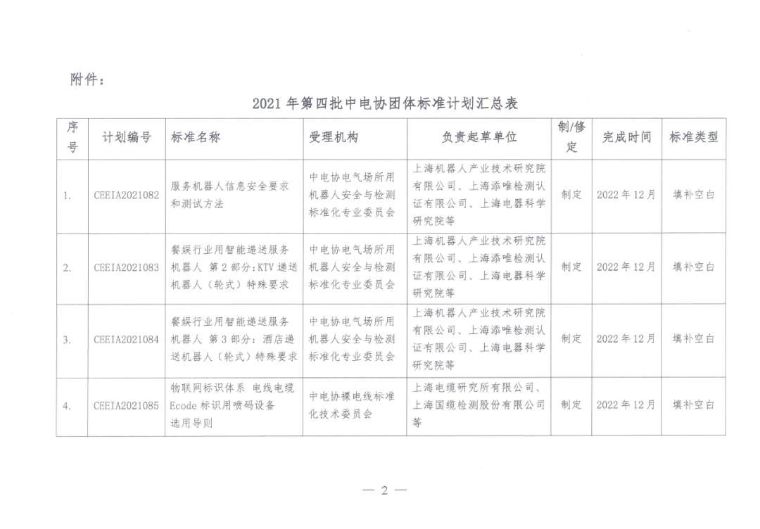 2021年11月26日,中电协标【2021】210号《关于下达2021年第四批中电协团体标准制定计划的通知》拟下达了多项机器人标准计划,其中包括《服务机器人信息安全要求和测试方法》。